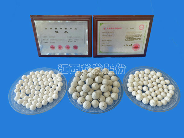 曲纹型开孔瓷球是在惰性氧化铝瓷球的基础上通过改变外形设计制成的一种硫酸,石油化工和其他化工行业中的转化器的催化剂承垫床用的新型支撑,覆盖用的球形填料。该产品在工作环境中既能满足其基本使用要求的同时还能满足更好的工艺技术要求即产品具有高的机械强度、耐高温、耐急冷急热、抗氧化、耐磨损、低化学活性而强耐酸碱腐蚀的同时,还有较大的比表面积和空隙率、可代替情性氧化铝瓷球在硫酸、石油化工和其他化工行业中使用,其效果大大高于情性氧化铝瓷球,对提高装置的运行效率、降低装置的运行费用,提高产品的质量而增加经济效益有重要作用。